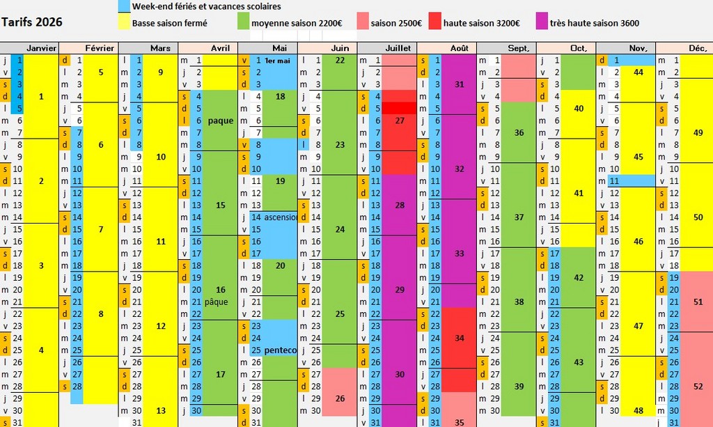 Tarifs à la semaine pour l'année 2026 --- Pour séjour plus court demander un devis